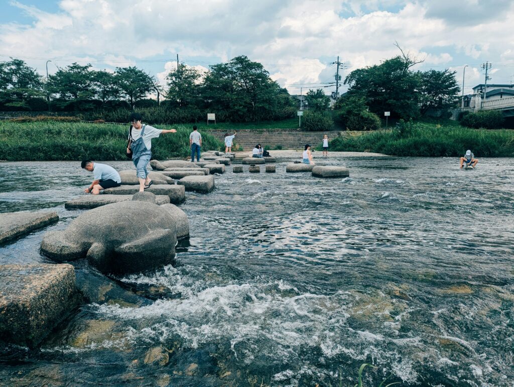 At the Kamogawa Delta, you’ll find similar stones shaped like turtles and plovers. Watching grown adults nervously hopping from turtle to turtle with their work bags is a joyous sight. Just be careful—after a heavy rain, the water level rises and the turtles “dive” underwater. Don’t try to cross if the stones are wet!